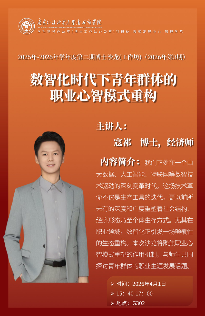 内容简介:我们正处在一个由大数据、人工智能、物联网等数智技术驱动的深刻变革时代。这场技术革命不仅是生产工具的迭代,更以前所未有的深度和广度重塑着社会结构、经济形态乃至个体生存方式。尤其在职业领域,数智化正引发一场颠覆性的生态重构。本次沙龙将聚焦职业心智模式重塑的作用机制,与师生共同探讨青年群体的职业生涯发展话题。