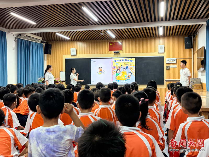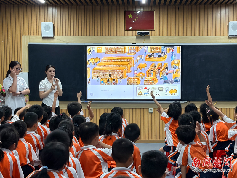 本网讯 4月8日下午,教育学院学子在白云区平沙小学多功能教室顺利开展《图书馆第一课》信息素养主题课程。在学前教育系副主任陈智秀老师与白云区图书馆张惠芳老师的共同指导下,主讲人巫敏琳同学联合助教谢林涛、吴思霖同学,以饱满的热情和充分的准备,为孩子们开启了一场充满惊喜的图书馆探秘之旅,助力少年儿童信息素养启蒙与良好阅读习惯的养成。