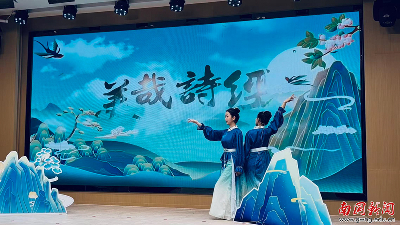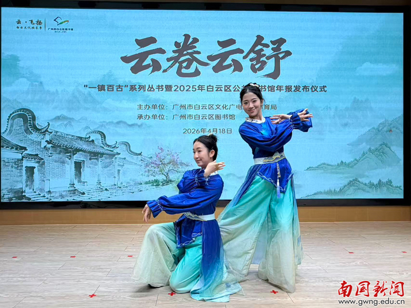 本网讯 春和景明,书香致远。第31个世界读书日来临之际,首个“全民阅读周”同步启幕,恰逢广州市白云区图书馆建馆七十载、新馆五载的重要节点,一场兼具文化厚度与青春活力的盛会如期举行。4月18日上午10时,由白云区文化广电旅游体育局主办、白云区图书馆承办的“‘云卷云舒’——‘一镇百古’系列丛书暨2025年白云区公共图书馆年报发布仪式”,在该馆负一层学术报告厅隆重举办。教育学院杜润清、叶婷前赴白云区图书馆参演,凭借精心编排的《美哉 诗经》惊艳登台,以朗诵传情、舞蹈表意、场景造势,为书香之约注入青春力量,彰显了我院学子传承中华优秀传统文化的责任与担当。