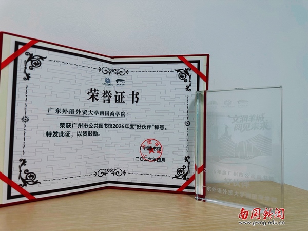 本网讯 4月19日,在2026年“4・2国际儿童图书日”暨“广州读书月”之“最佳未成年人阅读推广伙伴”推荐活动中,广东外语外贸大学南国商学院荣获“广州市公共图书馆2026年度‘好伙伴’”称号,彰显了广外南国在儿童阅读推广、馆校协同育人与社会服务领域的突出成效。