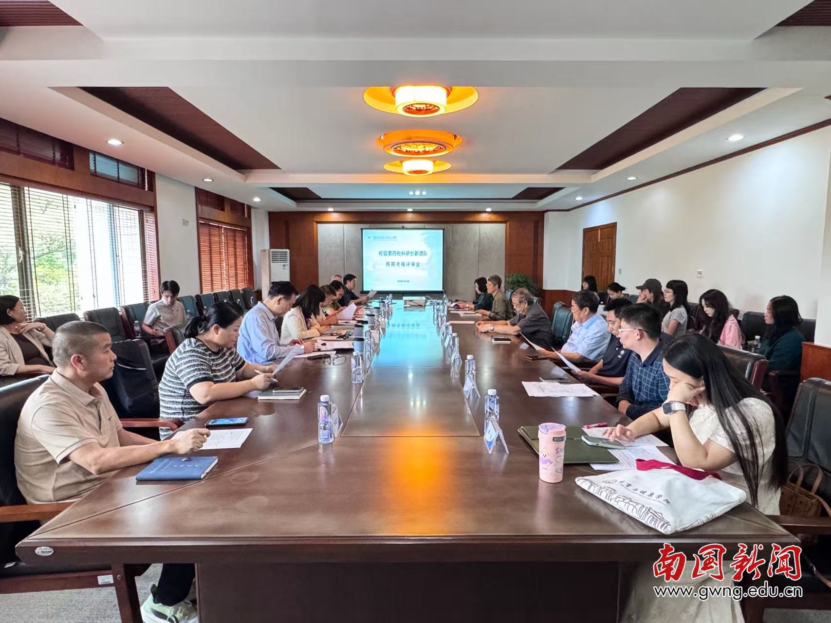 本网讯 4 月23 日下午,我校在行政楼309会议室召开第四批校级科研创新团队终期验收评审会,11个校级科研创新团队集中迎接验收考核。本次会议旨在全面总结科研创新团队建设成效,深化“有组织科研”改革,推动产学研深度融合。执行校长张汉林教授、副校长王关义教授出席会议,特邀中山大学钟智锦教授、华南理工大学钟书能教授、广东财经大学马持节教授组成校外专家组进行咨询指导,科研处副处长许军主持会议。