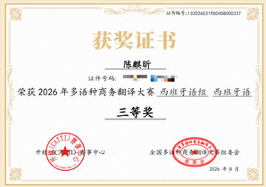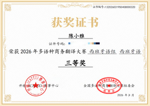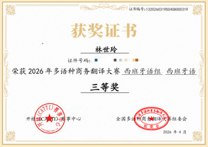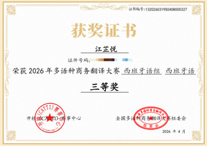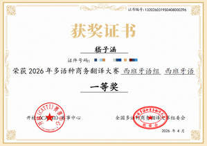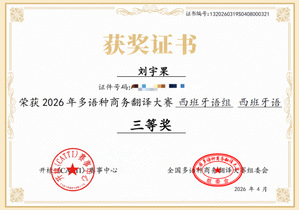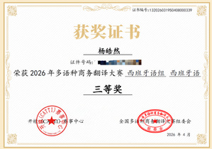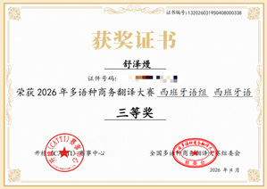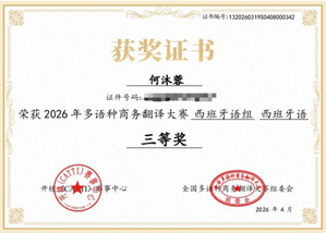 本网讯 近日,2026年全国多语种商务翻译大赛圆满落幕,我校学子在赛事中表现突出,共斩获1项一等奖、8项三等奖,同时,西班牙语系李翔老师凭借扎实的专业素养与悉心细致的赛事指导,获评“优秀指导教师”荣誉称号。