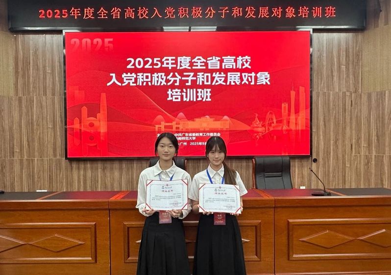 为深入学习贯彻习近平新时代中国特色社会主义思想,全面贯彻党的二十大和二十届历届全会精神,严把党员发展“入口关”和“质量关”,全面提升入党积极分子和发展对象的政治素养和理论水平。2025年9月24日至29日,由中共广东省委教育工作委员会主办的“2025 年度全省高校入党积极分子和发展对象培训班”在华南师范大学成功举行。我校杨岚、刘家乐同学分别作为发展对象和入党积极分子,与来自全省高校的125名学员,共同参与了为期三天的集中培训并顺利结业。