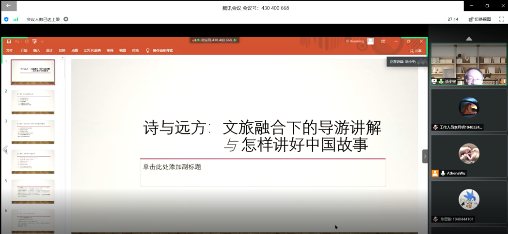 5月28日,由大学英语教学部主办,以“诗和远方:文旅融合下的导游翻译与怎样讲好中国故事”为主题的旅游英语讲座在腾讯会议线上举行。此次讲座特邀毕小宁教授作为主讲人,并由大英部副主任吴宇媚主持。 (图为吴宇媚副主任在主持讲座) 讲座以对“诗与远方”的解释引入主题,解说了文化与旅游的关系,东西方文化的差异对导游翻译的影响以及如何讲好中国故事。毕小宁教授指出,在文化与旅游的关系中,文化是灵魂,而旅游是载体,他讲解了一系列热点名词,加深同学们的理解。他以抗疫援外活动中物资上的文字信息为例,向同学们说明文化信息传递的重要性,让同学们了解到相关名词的正确表达形式。毕小宁教授以多个“中式英语”的例子分析了文化差异对语言和文化价值观的影响以及母语和客语之间的差异,让同学们充分理解到不同国家间的文化差异对语言理解的影响。毕小宁教授用剪羊毛表演与同声传译的例子强调,要讲好中国故事需具有跨文化交际意识和传递文化的意识,巧妙运用外语思维和语言习惯向外国人介绍旅游景点背后的故事,这样更能让游客对我国文化产生兴趣。 (图为毕小宁教授在做讲座) 毕小宁教授总结到,在学习语言的过程中,我们要始终秉持传递文化的意识去讲述中国故事,这样不仅可以更好地传递我国文化,同时也可增进了国家与国家之间的交流。 毕小宁教授是我国仅有的26名国家特级英语导游之一,资深旅游专家。从事外事、旅游工作40余年,曾在国家旅游局驻澳大利亚办事处工作5年,在甘肃省中国国际旅行社担任总经理18年,具有扎实的翻译理论知识和丰富的实践经验,并多次担任全国导游大赛评委、全国高职院校导游项目竞赛英文组裁判。(大英部 王瑞英、CEO新媒体部)