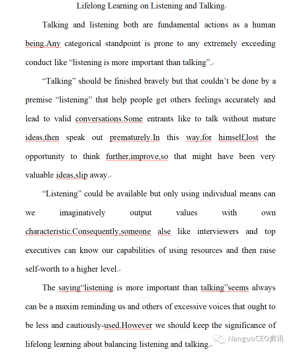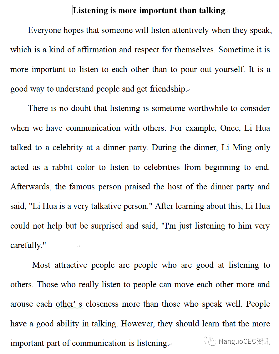 I firmly believe that listening is of greater significance than talking. For one thing, if you cannot listen correctly, you cannot talk properly. Just imagine a world where everyone keeps talking but nobody listening, it’ s useless to say anything then. For another, if you want to make achievement in social settings, relationships and business, one way to ensure your success is to be a great listener.