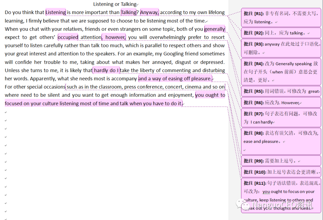 · 审题与内容:审题有失偏颇。内容变成比较talking和listening。