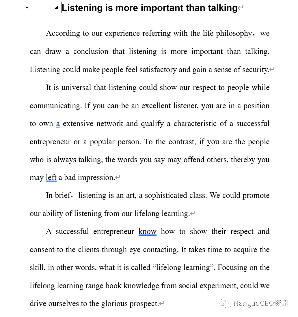 As we all known, talking and listening are commonly used in communication, but how can you talk without listening to others? Good conversation skills include much more than simply talking to others, listening is also a necessary quality of a successful person.
