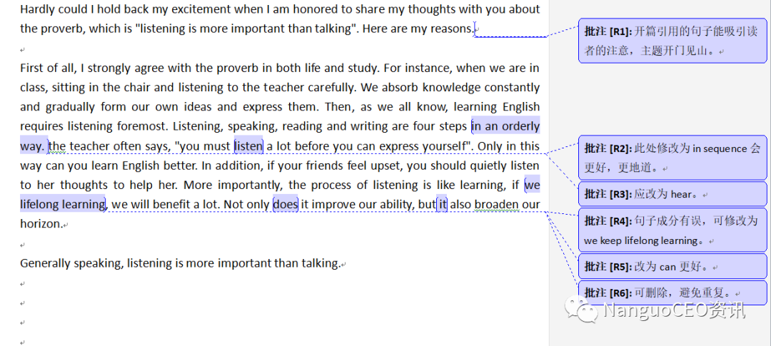 · 语法结构:句子表达通顺,能做到简单句与长句复杂句等多种句式相结合,没有严重的语法错误;但有些地方词汇重复,欠缺不同方式的表达。建议多累积词汇,用不同词汇表达相似的意思。若能注意以上问题,此篇文章是能够得12分的。