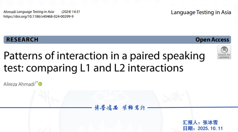 10月11日晚,大学英语教师发展研究所第三十九期学术研讨会于线上顺利举行。本次研讨会聚焦“配对口语测试中的互动模式”研究,华南理工大学徐鹰教授博士生团队导读合作进行。本次研讨会由徐鹰教授主持,博士生张冰雪担任论文导读人围绕Alireza Ahmadi 2024年发表于Language Testing in Asia的论文Patterns of Interaction in a Paired Speaking Test: Comparing L1 and L2 Interaction展开深入探讨研究所部分成员参与研讨。
