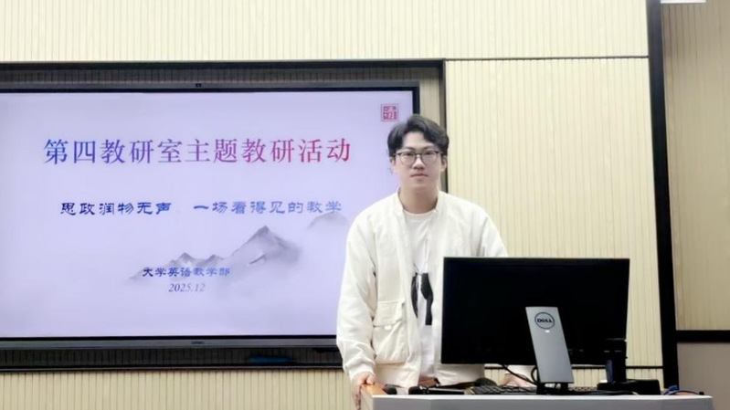 12月4日,大学英语教学部第四教研室成功举办“思政润物无声,助力教学成长”主题教研活动。活动由于洪鉴老师主持,周丽姿老师担任主讲人,围绕思政元素与大学英语教学的融合创新进行了深入分享和探讨。
