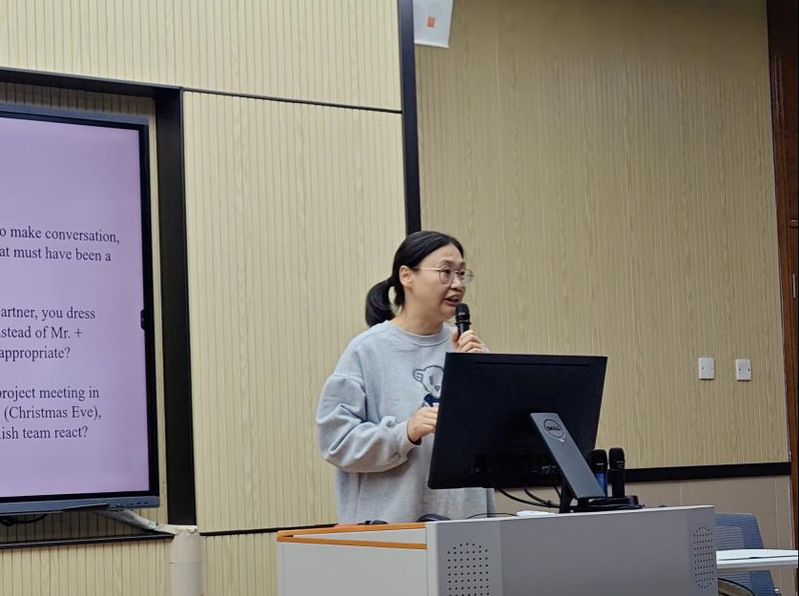 随后,刘杰老师代表《“一带一路”文化概况》课程团队,分享了课程思政融入教学的实践案例与成果,重点展示了该课程围绕“一带一路”国家跨文化商务交际所开展的教学创新。课程通过知识竞赛、情景分析、文化对比等多元形式,推动文化认知与实践能力的深度融合。在教学案例方面,课程以“认知—分析—应用与反思”为主线展开教学设计。以波兰单元为例:首先,通过“丝路快车竞答赛”,围绕波兰货币、诺贝尔奖得主等主题展开知识问答,结合国家概况与文化概念讲解,夯实学生的文化认知基础;其次,借助文化情景卡,引入波兰历史敏感话题、商务礼仪误区等真实情境,引导学生分析文化差异对商务活动的具体影响;最后,通过总结“与波兰人交往的黄金法则”,强调尊重历史、逐步建立信任、重视宗教影响等原则,助力学生实现从理论认知到行为反思的跨越。在成果展示方面,课程团队突出了跨文化能力培养的实践成效。刘杰老师以学生视频作业、文化对比活动等可视化成果为例,进行了生动介绍。学生以小组形式创作了5至7分钟的国家文化宣传片,涵盖对象国介绍、与中国的合作联系等内容,并自主设计互动环节,锻炼了文化输出与交际能力。此外,课程还引导学生围绕中俄集体主义观念、中哈待客之道、中泰沟通方式差异等主题,运用思维导图进行文化比较,深入理解文化差异背后的价值观与行为逻辑。