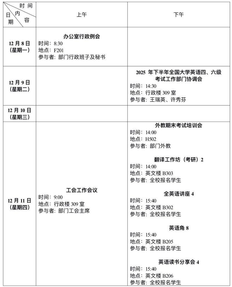2025年秋季学期第14周会议和活动安排表