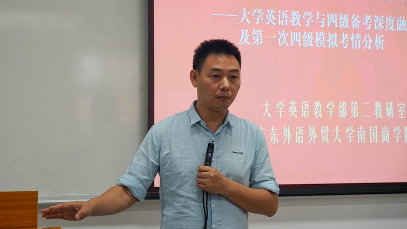 4月2日下午,大学英语教学部第二教研室在英文楼B303举行了“四级融通·课堂提质——大学英语教学与四级考试深度融合实践探讨暨第一次四级模拟考情分析”专题教研活动。本次活动由第二教研室主任何承辉老师主持,教研室全体教师参加。