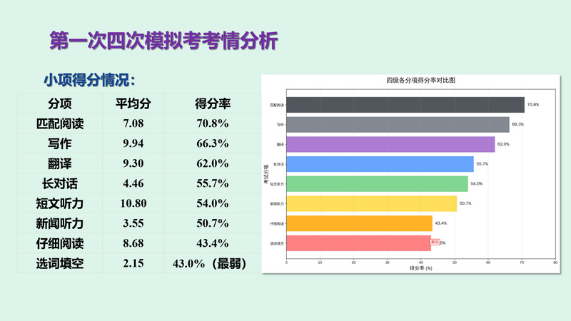活动伊始,何承辉老师基于本学期第一次四级模拟考试数据进行了详尽的考情分析。本次模拟共有1475名学生参考,覆盖52个班级,参考率为69.7%。整体平均分为55.65分(满分710分),及格率为49.63%。针对不同分数段学生,何老师提出了分层备考建议。
