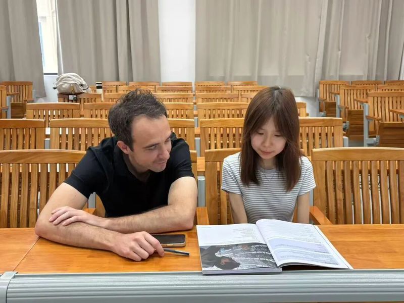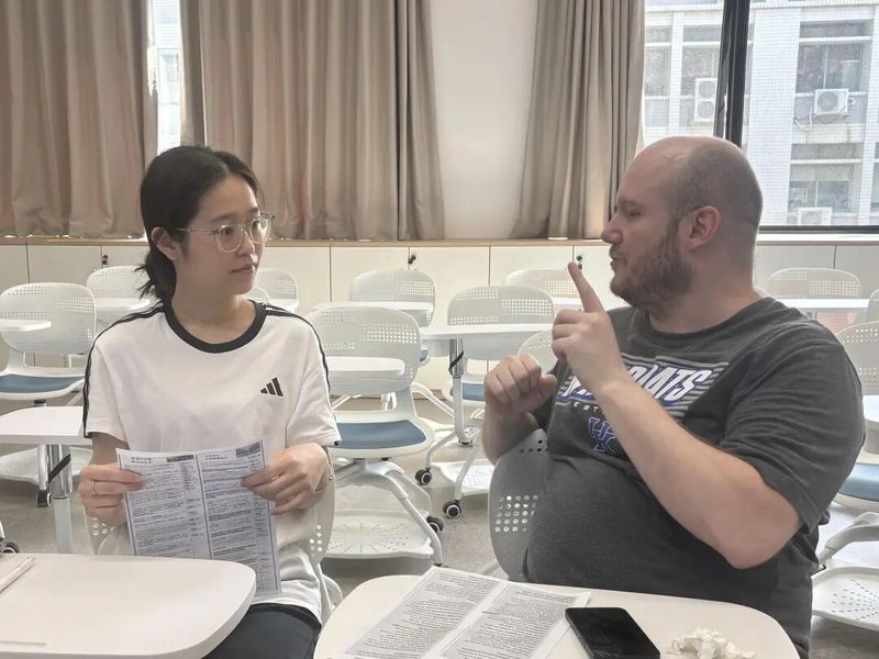 Vincent老师侧重基础夯实,耐心引导同学们克服开口难。交流中,一名同学朗读自备的英语文章,老师逐句拆解内容,针对发音偏差、连读技巧、重音把控等问题逐一示范纠正,同时解答文章理解、词汇运用方面的困惑,全程给予肯定与鼓励,帮助同学克服开口紧张的情绪。另有同学与老师围绕中国美食、校园生活等话题展开交流,在轻松的对话中积累生活化表达词汇,锻炼口语逻辑与表达流畅度。
