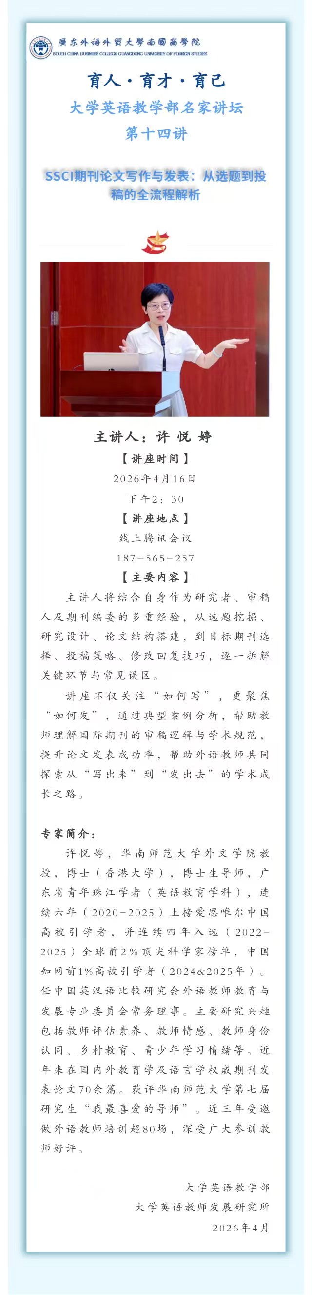 大英部名师讲坛第十四讲:SSCI期刊论文写作与发表:从选题到投稿的全流程解析