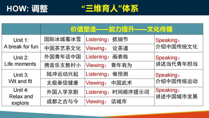 在教学设计方面,孔老师展示了四个单元的内容重构案例:Unit 1围绕中国茶艺文化,将听力训练聚焦细节抓取,口语任务设计为介绍传统文化;Unit 2以音乐支教为素材,引导学生讲述当代青年的责任与使命;Unit 3结合太极拳等传统运动,鼓励学生介绍中国武术;Unit 4以城市发展为主题,引导学生讲述中国城市变化。通过这一系列设计,孔老师将思政元素自然融入听说教学各环节,实现了语言能力培养与价值引领的有机统一。