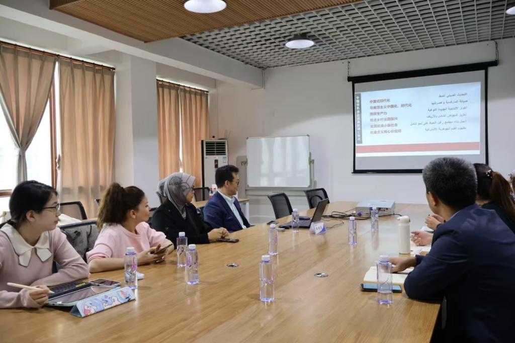 交流会上,王有勇教授结合自身丰富的翻译经验与深厚的学术造诣,深入剖析了中国特色政治话语的内涵、特点及其对外翻译传播的战略意义。他重点强调了此类翻译工作首先应该具有中国立场,其次需要具有国际视野和他者意识,从而实现思想内容与表达形式的有机统一。王教授通过一系列生动详实的案例,具体阐释了如何精准把握中国政治术语、方针政策表述的文化内核,并寻求在阿拉伯语世界中最为贴切、等效的表达方式,避免因文化差异可能导致的歧义或误解。