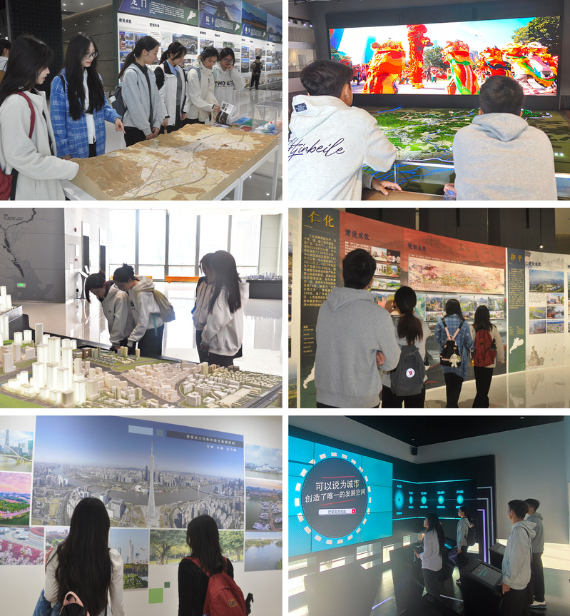 广州市城市规划展览中心作为彰显广州城市魅力的核心窗口,系统串联起城市从千年商都到现代化都市的发展脉络,是展现规划成果与地域文化的重要平台。师生们首先踏入“千年商都·城市脉络”展区,贯穿长廊的动态时间轴墙播放的《广州·生长的天际线》主题短片,清晰呈现从南越国到粤港澳大湾区的发展历程;随后在二层核心展示区,通过老城区复原沙盘、全息影像剧场及沙盘动态演示等,深入了解历史城区保护、骑楼活化等规划实践,展厅西侧文创体验区的古建筑拼装模型更展现了建筑文化的传承创新。拾级而上来到三楼环形平台,巨型城市沙盘在LED矩阵照耀下铺展,“黄金三角”岸线、各大产业集聚区错落其间,3D全息投影立体呈现交通与生态布局,让大家直观感受四中全会高质量发展部署在广州的实践落地。
