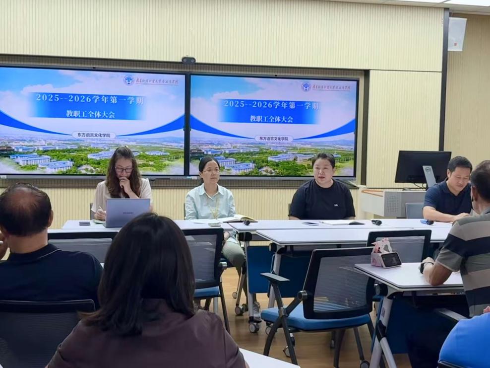 9月3日上午,东语学院在G302召开新学期全体教职工大会,部署本学期相关工作。会议由池圣女院长主持,包括外教在内的全体教职工参加会议。