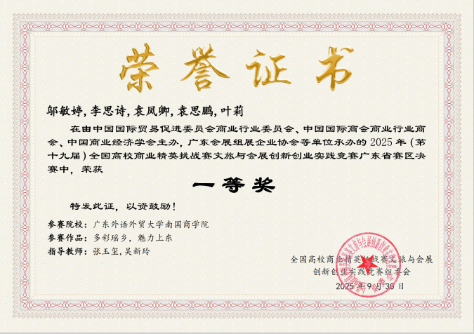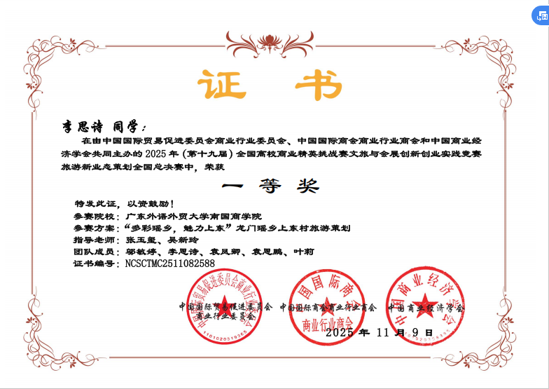 近日,2025年全国高校商业精英挑战赛文旅赛道全国总决赛捷报传来!我校两支跨学科团队——“翻山越岭侗声鸣队”与“云岭瑶韵队”,先以优异表现斩获广东省赛区一等奖,顺利晋级全国总决赛,最终力克群雄双双荣膺国家一等奖。其中,东语学院朝鲜语专业2023级学生李思诗凭借其出色地创新能力和扎实的专业知识,助力“云岭瑶韵队”夺得优异成绩。