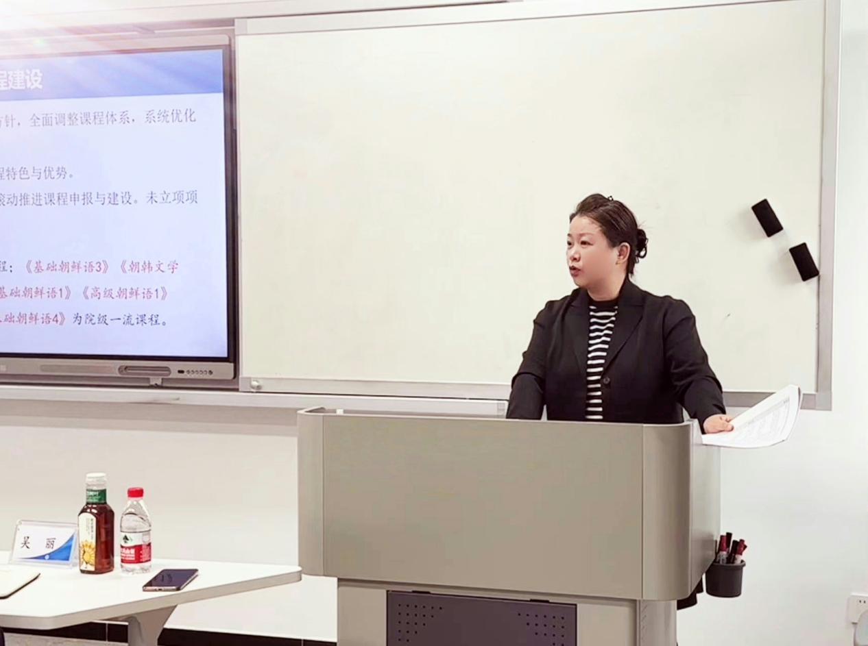 会议伊始,日语系专业负责人曹美兰教授围绕“指导思想、建设成果、推广辐射、问题与改进”四个方面,系统汇报了日语专业获批国家级一流建设点以来的建设成效。随后,学院院长、朝鲜语系专业负责人池圣女教授从“课程建设、教材建设、教育教学改革、师资队伍建设、实践实训、学生培养及经费使用”等多维度,详细介绍了朝鲜语省级一流专业建设点的进展。