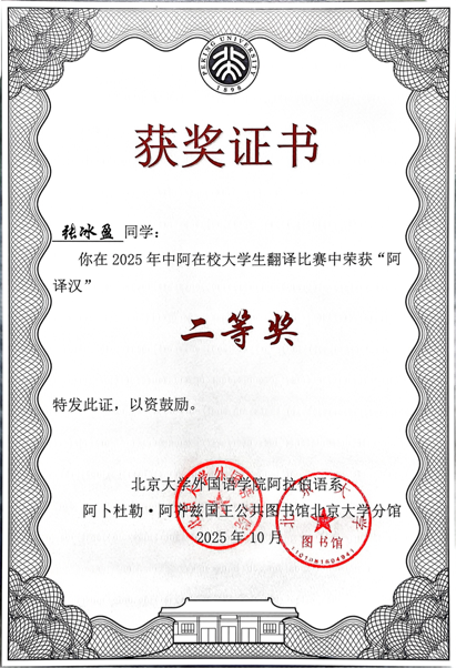 此次获奖,不仅充分展现了张冰盈同学在阿拉伯语翻译领域的优秀能力,还体现了我校在外语人才培养方面的扎实成效。阿语系将继续鼓励学生积极参与高水平专业竞赛,在更广阔的平台上锻炼能力、展现风采。(闫庶峰)