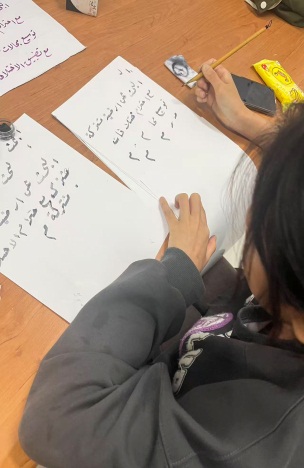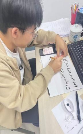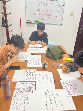练习室内,墨香四溢,学习氛围浓厚。同学们手握传统的阿拉伯语书法笔,热情高涨。从字母的基本结构、笔画的长短比例,到连写的流畅度与整体的布局谋篇,大家不放过任何一个细节,进行了一遍又一遍的揣摩与练习。每一次运笔的提按转折,都凝聚着对阿语书写规范的深刻理解。