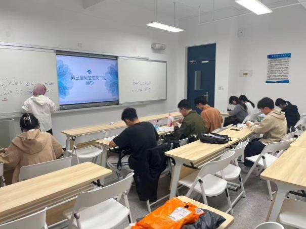 11月26日,多语种大楼H908教室化身成为阿拉伯文化艺术的展示殿堂,一场专为23、24、25级阿拉伯语专业学生举办的阿拉伯语书法大赛在此举行并圆满落幕。