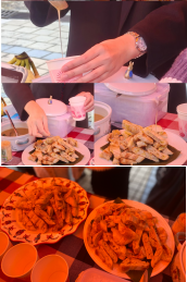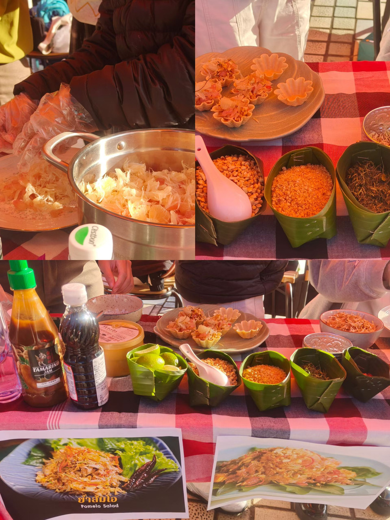 味觉体验成为活动的一大亮点。在泰国特色美食品鉴区,2024级学生制作的凉拌柚子清新爽口,2022级、2023级学生协作完成的烤香蕉香气四溢,吸引众多师生驻足品尝。现场参与制作的学生一边分发美食,一边介绍泰国饮食文化,让味觉体验与文化学习深度融合。