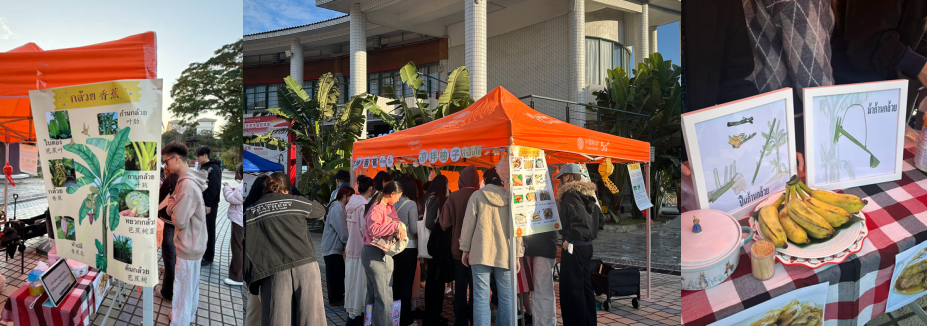 活动现场人头攒动,泰式风情扑面而来。现场以“芭蕉与泰国人的生活方式”为主题布置文化展板,从椰奶粉蕉、芭蕉干等特色美食,到“以芭蕉为礼”的民俗传统,再到相关泰语谚语与日常表达,全方位解码了“芭蕉文化”在泰国社会中的独特地位,成为学生了解泰国文化的“可视化教材”。