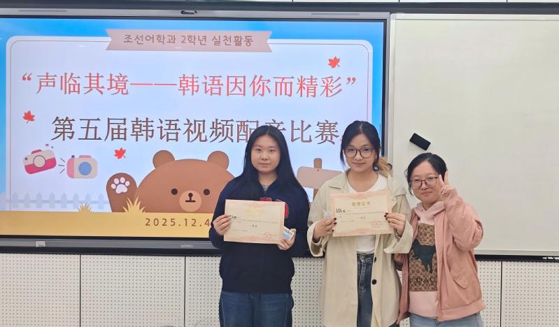 经过激烈角逐,评委们根据选手的综合表现进行了公正评分。24级高灏珉和李凯欣带来的动漫片段《丫丫的日常》获得一等奖。比赛结束后,朝鲜语系系主任金丽华老师对本次大赛进行了总结。她充分肯定了参赛学生的出色表现,指出配音比赛不仅是语言技能的练兵场,更是深入了解韩国文化、提升艺术感知力的有效途径。她表示,同学们通过声音塑造角色、演绎剧情,展现出了朝鲜语系学生良好的专业素养与青春活力。金主任也鼓励全体学生以赛促学,持续夯实语言基础,积极投身于各类专业实践活动中,不断提升跨文化沟通与综合应用能力。