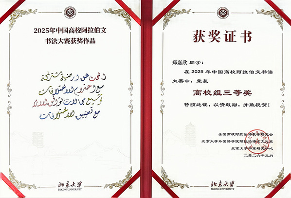 近日,2025年末圆满落幕的中国高校阿拉伯文书法大赛获奖证书正式送达我校。在本次赛事中,我校阿拉伯语学子凭借扎实的专业功底与精湛的书写技艺荣获高校组三等奖,学校获评优秀组织奖。