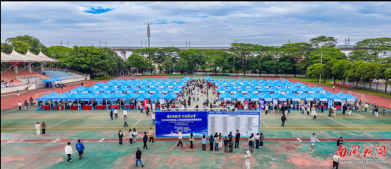 On the afternoon of October 23, the track and field ground of SCBC was bustling with activity for the 2026 Graduates' Job Fair (Comprehensive Special Session). Nearly 200 companies brought over 8,000 job openings to recruit talent. Graduates from majors such as International Trade, Business English, and Marketing found numerous suitable positions. Due to their scarcity, Arabic majors were highly sought-after, highlighting the deep alignment between SCBC's “foreign language + specialized field” compoud talent cultivation model and market demand. President Wang Hua and Party Secretary Xu Zhichao personally visited the event for observance and guidance. They participated in the “Live Streaming” activity and conducted in-depth visits to the policy promotion zone and employment service stations, demonstrating SCBC's high priority on graduate employment and its multi-faceted efforts to promote it.