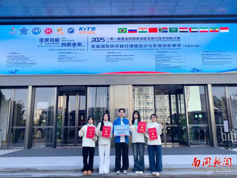 Triumphant news has arrived from the national finals of the inaugural International Study Tour Course Design and Implementation Innovation Competition. A team of four SCBC students won the bronze award in the First Design and Implementation of Innovative Competitions for International Research Travel Courses, part of the 2025 Belt and Road BRICS Competition of Skills Development and Technology Innovation (BCSDTI). The team comprises Chen Lingyi from the Hotel Management program and Deng Yaxin, Long Xingru, and Li Xianwen from the Tourism Management program. They were recognized for their outstanding travel design and implementation capabilities.