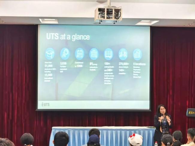 随后,劳老师向参会同学们直观展示了UTS的校园环境与建筑特色,快速吸引在场同学注意力。紧接着,她系统介绍了学校的基本信息,包括建校历史、办学定位、全球排名及优势学科分布,让同学们对UTS有整体认知。