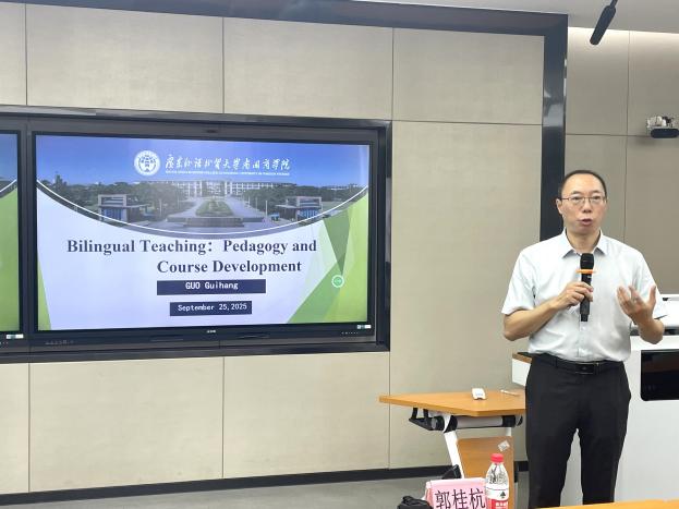 925日下午,管理学院在G304举办《双语课程建设及教学改革》专题讲座。本次讲座由管理学院副院长陈书星主持,特邀我校副校长郭桂杭作专题培训,旨在进一步提升教师双语教学水平,助力国际化人才培养。