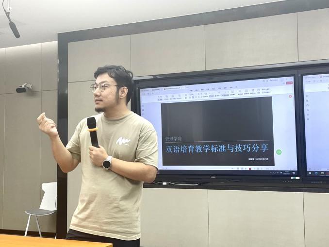 9月25日,管理学院于G304召开双语培育教学专题研讨会,45岁以下青年教师参会。会议由工商管理系主任冯炫淇老师主讲,围绕“双语培育课的内涵、授课技巧及听课标准”三大核心议题展开,结合前期实践经验,为青年教师提供系统指导,助力落实“十四五”规划中双语课程占比要求,推动学院双语教学高质量发展。