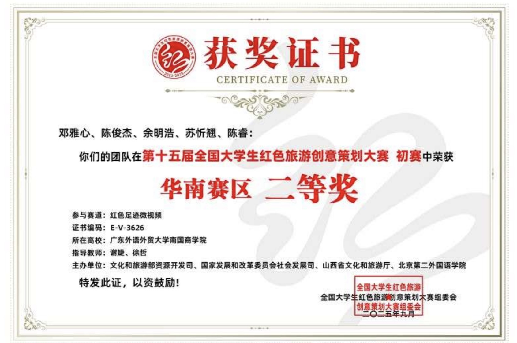 近日,第十五届全国大学生红色旅游创意策划大赛圆满落幕。由学生邓雅心、陈俊杰、余明浩、苏忻翘、陈睿组成的参赛团队,在“红色足迹微视频”赛道中表现出色,其参赛作品荣获华南赛区二等奖。