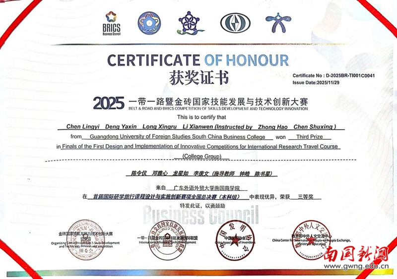 近日,2025年一带一路暨金砖国家技能发展与技术创新大赛首届国际研学旅行课程设计与实施创新赛项全国总决赛捷报传来!由我校酒店管理专业陈令仪,旅游管理专业邓雅心、龙星如、李羡文等4名同学组成的参赛团队,凭借出色的旅行设计与实施能力,获得全国总决赛铜奖,钟皓、陈书星为指导老师,张海燕老师为领队。广东省同样入围决赛的中山大学、广州南方学院获得优秀奖。
