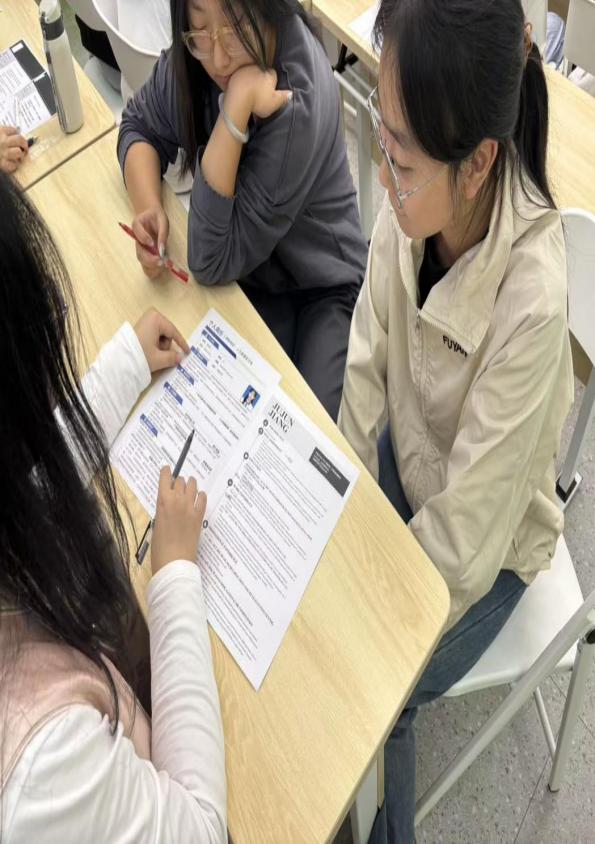 活动第二部分,一对一指导环节,同学们展现出高度的投入与主动性。大家轮流使用英语介绍自己的教育背景、实习经历与申请意向,并基于老师的建议现场调整简历内容。过程中,不少同学主动提问,就表达方式、经历梳理、技能呈现等细节与老师进行全英文交流。随后的模拟面试环节,同学们更是积极尝试用英语应答,锻炼即时组织语言与展示自我的能力,现场互动频繁、气氛热烈。