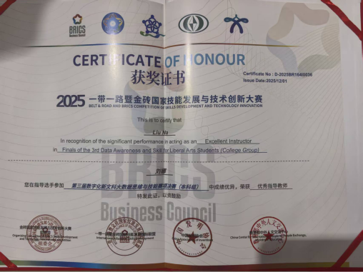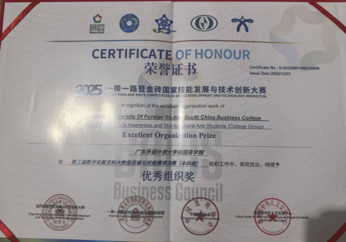 2025一带一路暨金砖国家技能发展与技术创新大赛之第三届数字化新文科大数据思维与技能赛项决赛于20251129-30 日以线上方式成功举办。经过激烈角逐,管理学院梁楚君、姚欣桐,胡嘉敏和莫佩仪团队荣获全国总决赛二等奖,陈子绵、陈怡霖、邹恩铭,文俊霖,谢伟明,刘子杰,李灿宇和舒同组成的两个团队荣获全国总决赛优秀奖。同时,指导教师刘娜荣获“优秀指导教师”称号,广东外语外贸大学南国商学院因组织工作出色获评“最佳组织奖”。