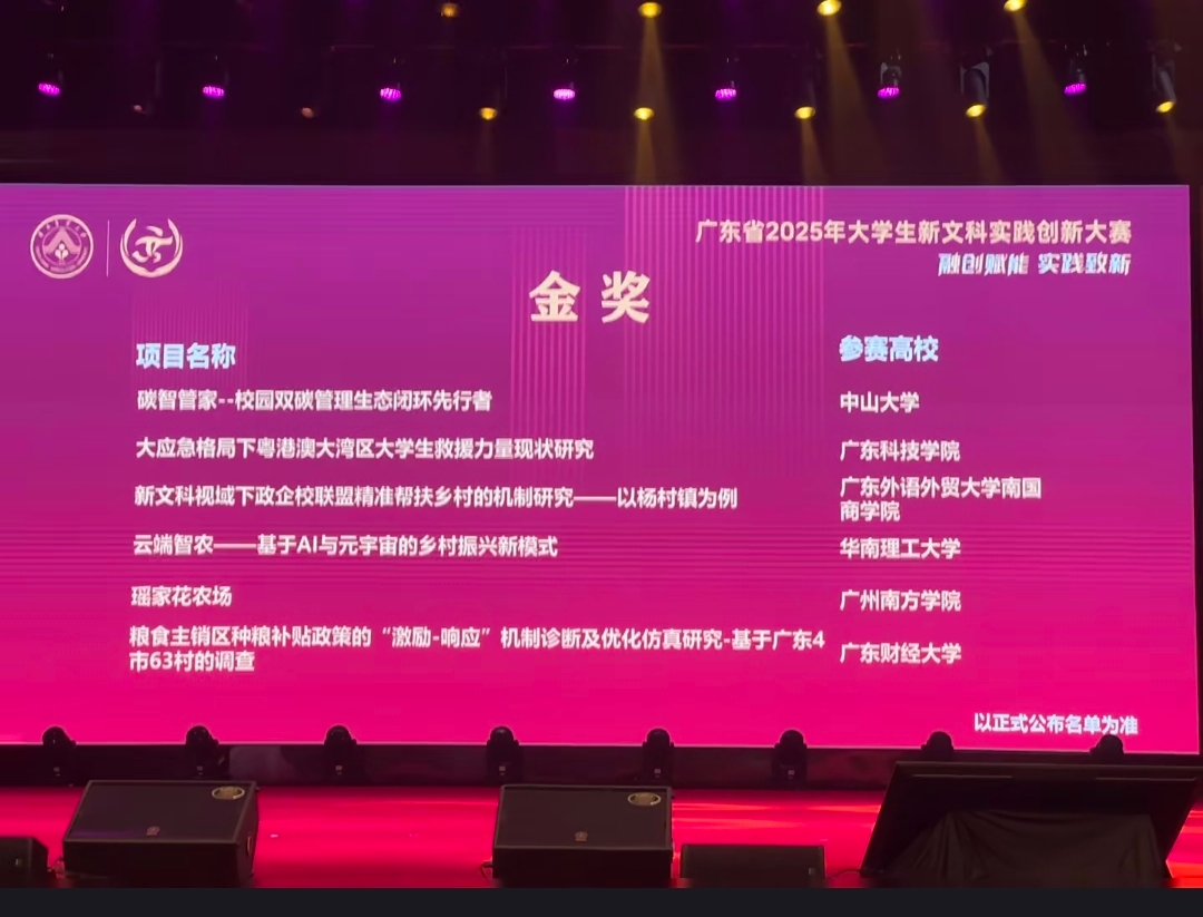 10月11日至12日,以“融创赋能 实践致新”为主题的广东省2025年大学生新文科实践创新大赛现场决赛在华南农业大学举行。本届大赛由全国新文科教育研究中心主办,广东省教育厅指导,华南农业大学承办,吸引了全省39所高校的219支队伍参加。 在本次比赛中,我院参赛团队表现优异,凭借扎实的调研功底、创新的项目设计和出色的现场展示,从众多优秀队伍中脱颖而出,斩获金奖。 此次获奖项目为《新文科视域下政企校联盟精准帮扶乡村机制研究——以杨村镇为例》,属于经济学、管理学、法学类组别。项目团队由谭子靖(负责人)、夏思佳、李奕三位同学组成,指导教师为翁丽丽、陈迪、王松艳。团队成员来自不同学科专业,充分发挥跨学科优势,深入杨村镇开展实地走访与调研,并以“政企校联盟”为核心,将高校的智力资源、企业的技术优势及政府的政策支持转化为乡村发展的内生动力,探索出短期精准帮扶与长期自我造血相结合的可持续乡村振兴路径,获得评审专家的高度认可。 展望未来,我院将继续坚持“以赛促教、以赛促学、以赛促创”的原则,不断提升大学生创新实践精神和创新创业能力,引导学子扎实开展专业学习,充分发挥文科培根铸魂的价值功能,为学校一流人才培养和高质量发展贡献力量。(供稿人:翁丽丽) |