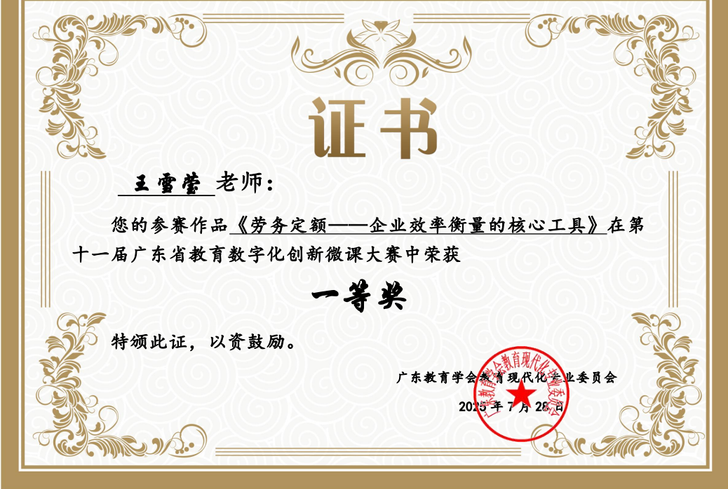 其中,我院王雪莹老师凭借作品品《劳务定额——企业效率衡量的核心工具》脱颖而出,荣获一等奖。王雪莹老师的微课作品紧密结合管理学科前沿动态,以案例教学为核心,通过生动的场景模拟、清晰的逻辑拆解,将复杂的理论知识转化为直观易懂的教学内容,既注重知识传递的准确性,又兼顾学生的学习体验,得到评审专家的高度认可。