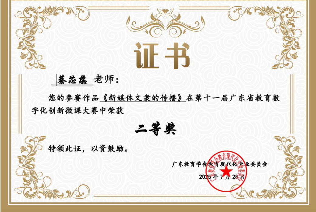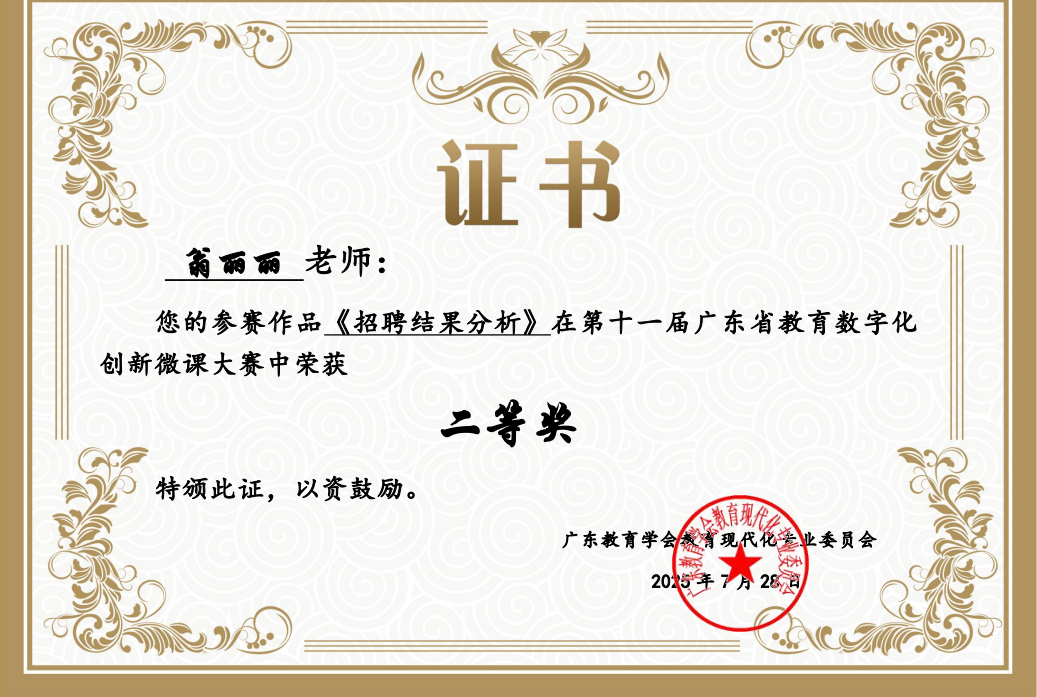 2025年7月27日,广东教育学会主办的第十一届微课大赛(高校组)评选结果正式揭晓,我院教师凭借扎实的教学功底、创新的课程设计,在赛事中表现突出,斩获多项荣誉,充分展现了学院教师队伍的教学实力与专业素养。
