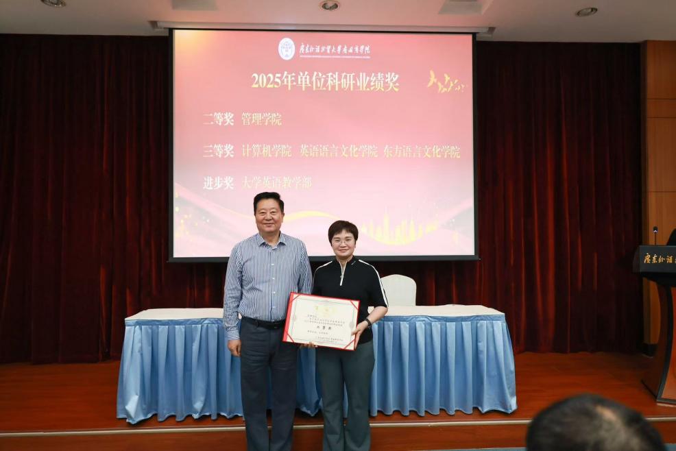 3月19日下午,2025-2026学年第二学期科研工作布置会在F101学术报告厅召开。会上,科研处对学校2025年度的科研工作进行了总结,并对2025年个人科研业绩奖、单位科研业绩奖和科研突出贡献奖获得者进行了表彰。管理学院凭借过去一年在科研领域的不懈努力与卓越表现,荣获单位科研业绩奖二等奖。同时,齐峰、王卫红两位教师也凭借各自在科研方面的突出贡献,分别荣获个人科研业绩奖。