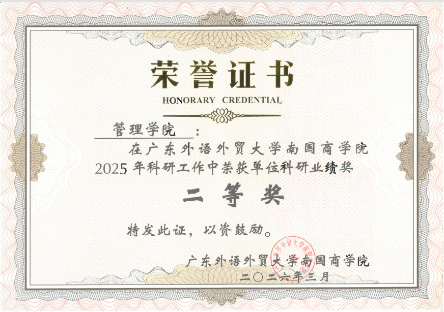 管理学院连续多年荣获单位科研业绩奖,在2025年的科研工作中荣获“科研业绩奖二等奖”,充分彰显了学院在科研领域的卓越表现和突出成绩。这份荣誉,不仅是对学院2025年度科研工作成效的高度认可,更是对全体教师潜心科研、锐意进取、奋勇争先的有力激励,为学院后续科研工作提质增效,推动学院科研工作向更深层次、更高水平迈进。
