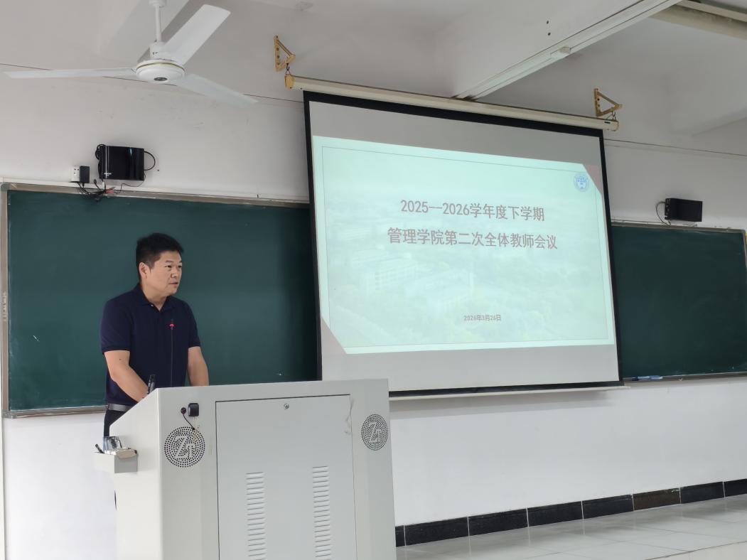 2026年3月26日下午,管理学院在G303召开2025-2026学年下学期第二次全体教师会议,全面部署新学期教学、科研、学生管理等重点工作,凝聚发展共识、明确工作路径。学院院长苏武俊教授主持会议,党总支书记、副院长文佑云,副院长陈书星,院长助理吴娜妹、书记助理梁秋燕及全体教师参会。