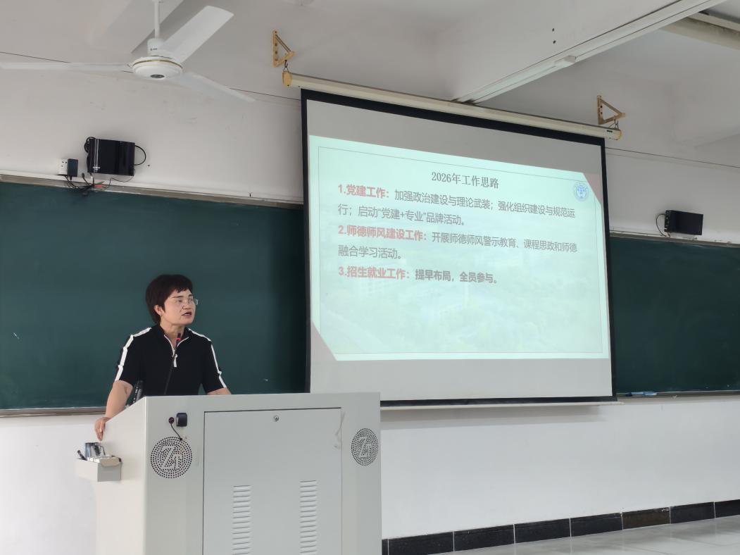 文佑云书记分享了学院2025年科研工作的亮眼成果,学院获单位科研业绩奖二等奖,充分彰显学院科研实力与发展潜力。同时,她明确2026年学院在党建工作和科研工作的整体思路,提出多维度推进各项建设:一是强化党建与师德师风建设,开展系列警示教育及学习活动;二是优化招生就业布局,科学调整招生数量,推动全员参与招生就业工作;三是培育优质科研团队,定期开展学术活动、攻坚高级别科研成果;四是搭建多元资源平台,推进产业学院建设;五是深耕人才培养,抓实学科竞赛与考研考证指导,全力推进硕士点建设及硕导队伍培育。