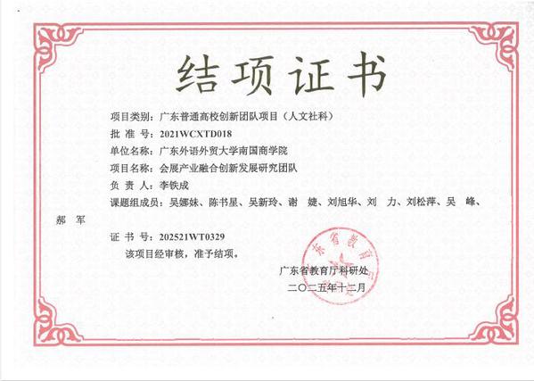 近日,广东省教育厅公布省级科研创新团队结项验收结果,我校管理学院李铁成教授主持的“会展产业融合创新发展研究团队”(结项证书编号:202521WT0329)顺利通过省级结项验收,成为我校首个通过省级结项验收的科研创新研究团队,标志着我校在省级科研创新团队建设方面取得重要进展。